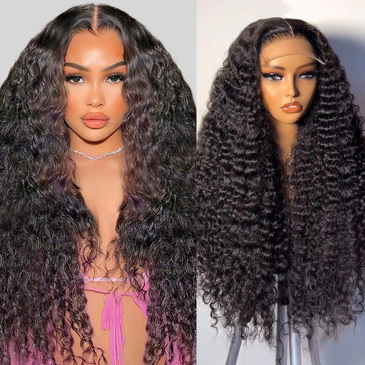 Lace Closure Wigs Human Hair Deep Wave Pre Plucked 5x5 Curly HD Transparent Lace Front Wigs with Baby Hair 180 Density Gluesless Human Hair Wigs for Women Natural Black Color 22 Inch