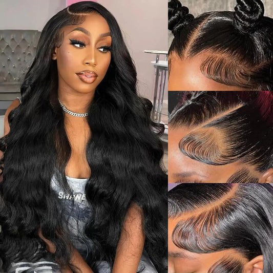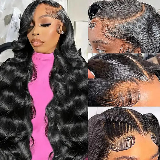 34 Inch Body Wave Lace Front Wigs Human Hair Pre Plucked 13x6 Lace Frontal Wigs 180 Density HD Transparent with Baby Hair Natural Hairline Gluesless Human Hair Wigs for Women Natural Black