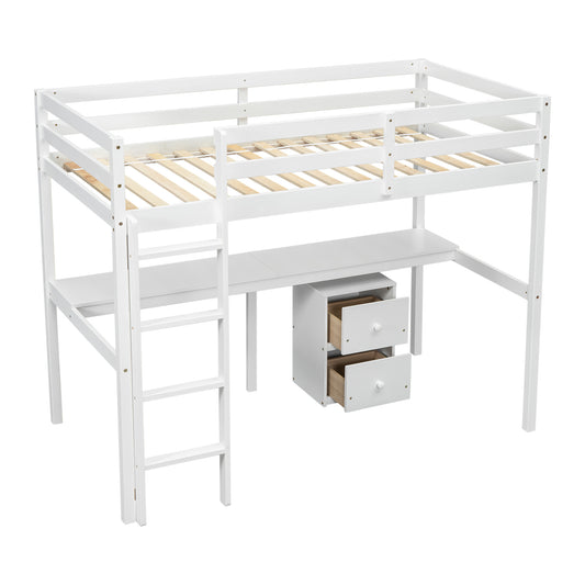Twin Loft Wood Bed with Under-bed, Built-in Desk, a Storage Cabinet of 2 Drawers, Guardrails, Ladder,White
