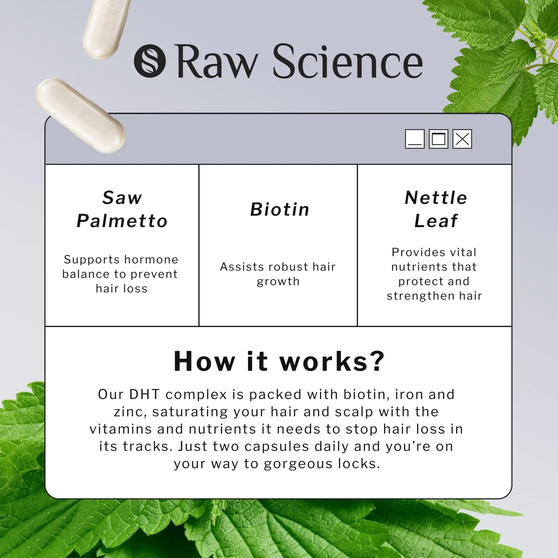 DHT BLOCKER FOR MEN & WOMEN DHT Blocking alongside saw palmetto oil can help repair a receding hairline. These incredible hair loss pills, also known as hair supplements for hair growth, are perfect for those struggling with mens hair loss. Try Raw Sciences anti hair loss DHT blocker to correct hair loss for men.