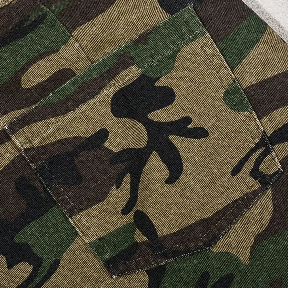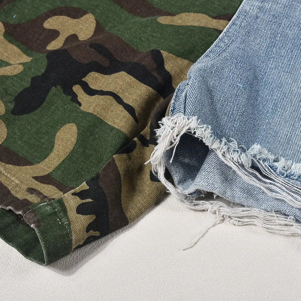 Elevate your streetwear game with these cool and casual denim shorts. The distressed detailing and camouflage print combine to create a modern and edgy look that's perfect for urban adventures.