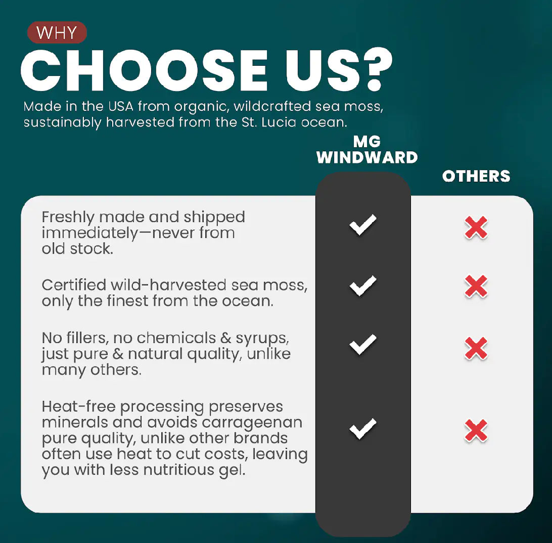 100% CERTIFIED WILD HARVESTED sea moss: Our wild harvested organic sea moss gel is sourced from the pristine waters of St. Lucia, free from pollution from ports and commercial traffic.
